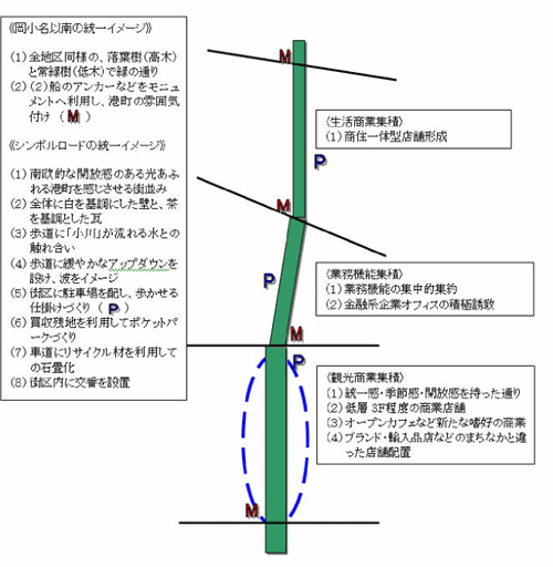 - 協定と合わせて、市の景観条例の適用(景観形成重点地区としての位置付け)などを求める他、小名浜のシンボル道路の沿道にふさわしい業種業態や営業形態等を明確にする法令による規制手段についても検討する。